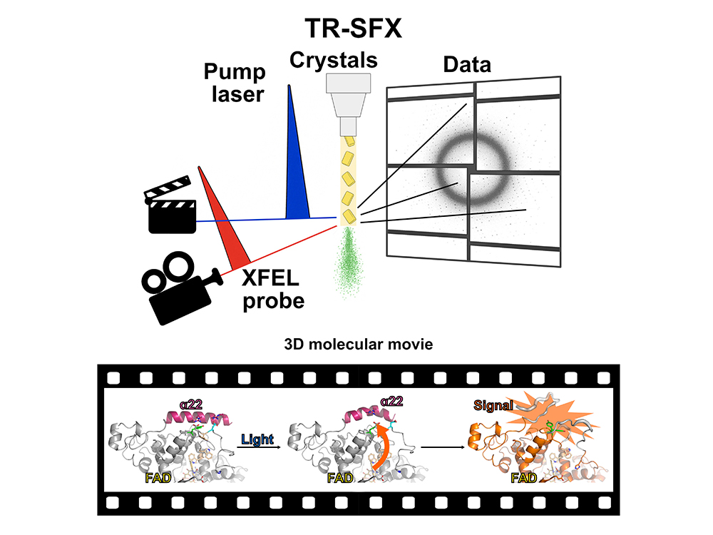 團隊應用時間解析序列飛秒晶體學 (TR-SFX) 技術,成功記錄隱花色素受光後19個連續的分子動態影像,時間跨度從10奈秒至233毫秒不等。光照後初期,隱花色素中的感光基團FAD吸收藍光,從蛋白質本體擷取電子,產生自由基對 (FAD•–/Y373•),進而活化3個關鍵區域:FAD結合位點、短暫質子轉移通道 (TPP) 以及鄰近Y373的螺旋α22。