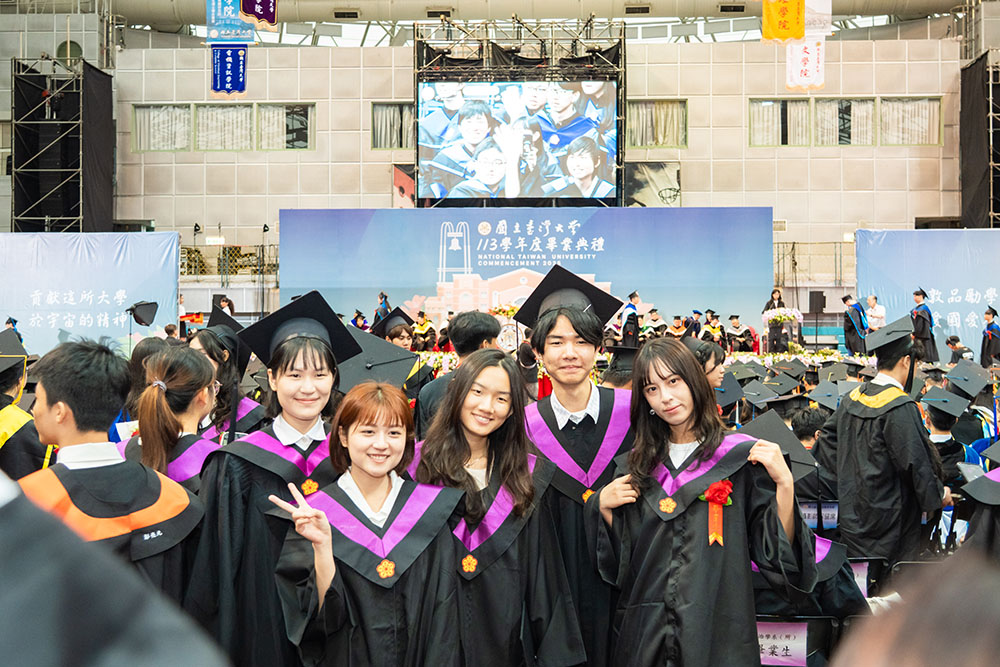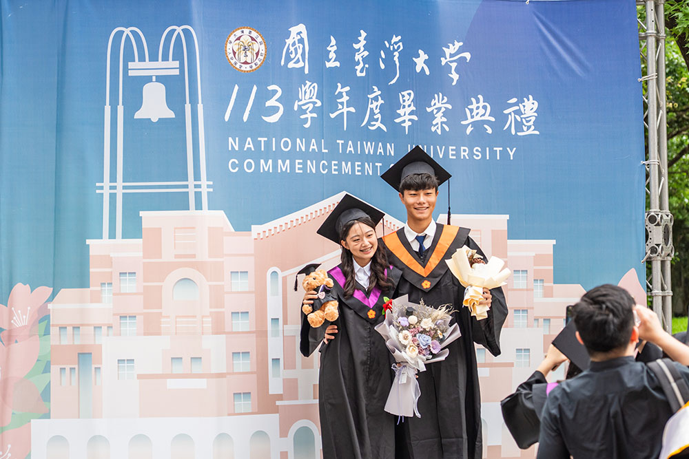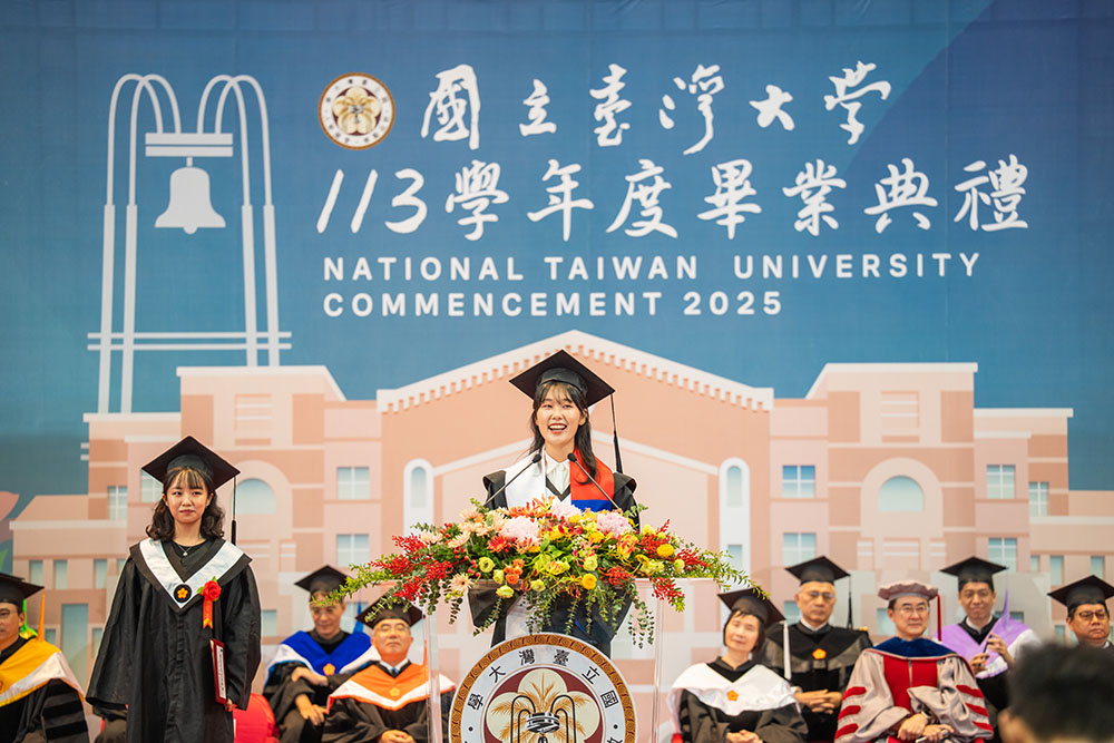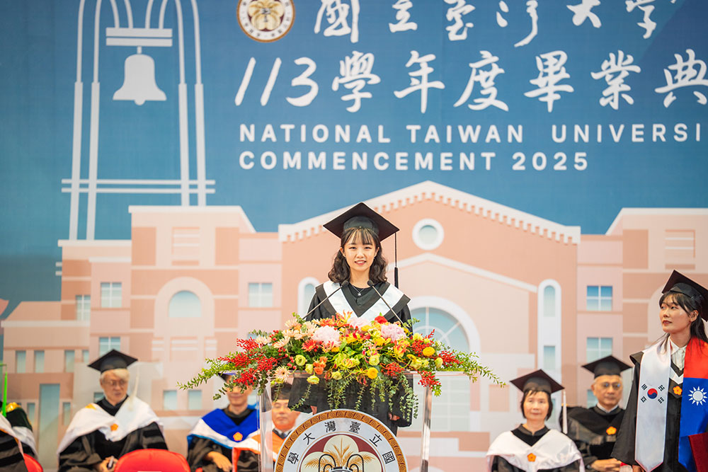 另外,今年本地生及國際生的畢業致詞代表分別為歷史系雙主修校學士的戴薇珊,以及中國文學系來自韓國的宋美娜 (Mina Song)。戴薇珊於致詞時表示,她跟大家一樣,進到臺大後不斷挑戰自己的舒適圈,從歷史系到校學士的跨領域學習,從文學到商業管理等。每次嘗試都發現自己新的一面,正是這樣多元且不設限的經歷,無論成功失敗,都讓生命變得豐富。她說,在大學生活裡勇於嘗試,並有接受失敗的勇氣是更為珍貴的,若畢業生們未來遇到挑戰讓人感到迷茫時,就回想當初在學校時的初心。