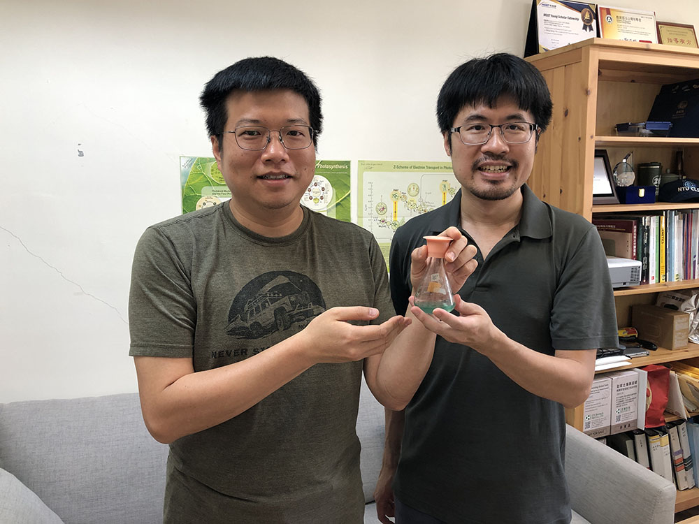 何銘洋老師(右)和江漢威博士(左)展示這株藍色的孑遺藍綠菌。