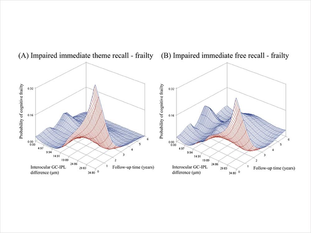 團隊早於2019年首次發現,視網膜節細胞-內網狀層(GC-IPL)厚度與認知功能障礙呈U型關係,即過薄或過厚皆可能增加認知下降的風險。然而病理機轉仍待釐清。此研究進一步證實,阿茲海默症關鍵病理蛋白(amyloid beta)於雙眼的不均勻沉積,可能導致視網膜神經厚度的不對稱,而這一變化主要出現在認知衰弱的前期階段。因此,GC-IPL厚度不對稱可望成為預測認知衰弱的早期生物指標。