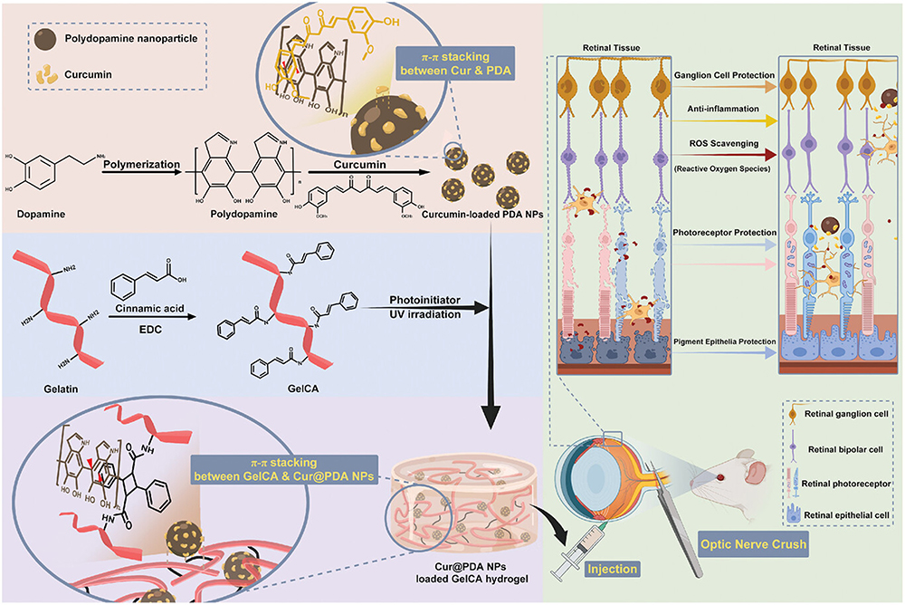 結合肉桂酸改質明膠、聚多巴胺奈米顆粒與天然抗氧化劑薑黃素,具有良好的視網膜內表面黏附性,可經玻璃體注射精準定位,並在小鼠視神經壓迫模型中證實具備急性期神經保護效果,顯著減少視網膜節細胞凋亡,降低發炎反應。
