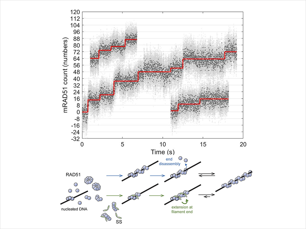 利用此技術,研究團隊首度量化RAD51絲狀體的逐步組裝過程,並觀察其受到輔助蛋白調控的變化。實驗發現,在無輔助蛋白的情況下,RAD51主要以八聚體(octamer)形式延伸,而加入SWI5-SFR1輔助蛋白後,延伸單位轉變為四聚體(tetramer)。此結果顯示SWI5-SFR1在溶液中改變了RAD51的寡聚狀態,並顯著降低其自DNA解離的機率,促進更穩定且一致的絲狀體組裝。