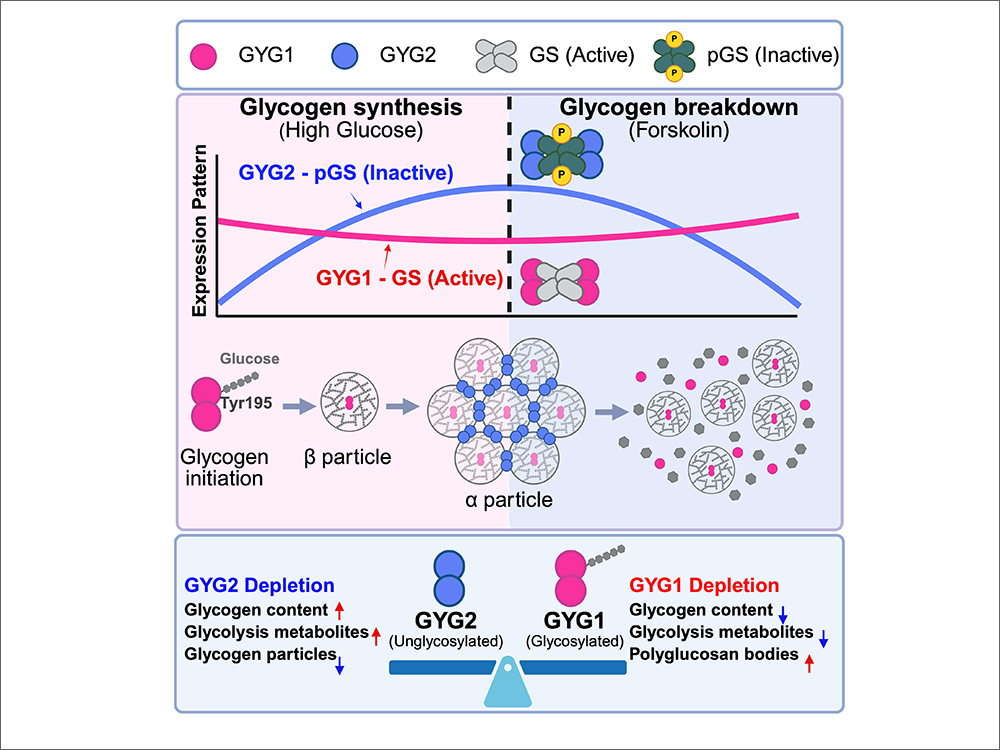 臺大生命科學系教授蔡素宜研究團隊利用人類多能幹細胞 (hPSCs) 與 CRISPR/Cas9 技術,成功建立 GYG1 與 GYG2 缺失的疾病模型,並與中研院分生所夏國強老師合作結合冷凍電子顯微鏡 (CryoEM) 與生化實驗,首次在分子層面揭示2者的分工。團隊發現,GYG1 具有強烈的自我醣基化活性,作為肝醣合成的起始關鍵;相對地,GYG2 雖不具此活性,卻能在特定情境下抑制合成,並調控肝醣顆粒大小。團隊並透過將人類幹細胞分化到心臟、肝臟、神經與骨骼肌細胞,證明 GYG2 參與肝醣顆粒組裝的功能,並與 GYG1 協同維持細胞葡萄糖恆定。