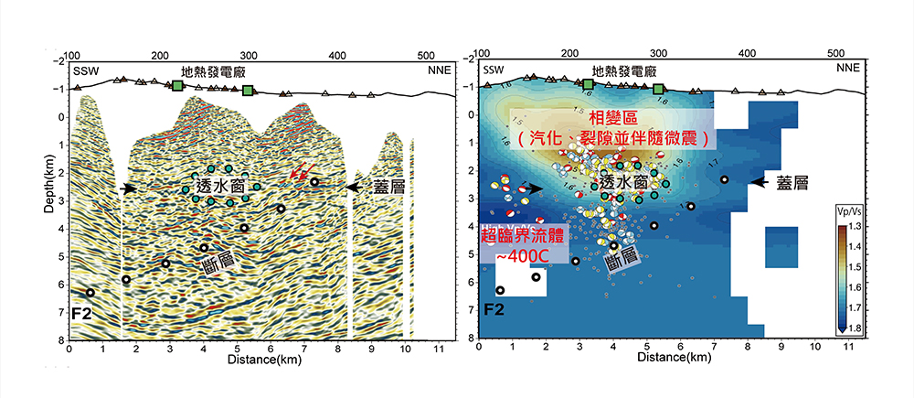 臺大新碳勘科技研究中心教授郭陳澔,在東京大學工學院教授辻健的邀請下,加入日本九州火山地震監測與超臨界地熱探勘研究團隊,共同獲取寶貴的探勘經驗與實質性的成果。此次研究成果發表於國際頂尖期刊《Communications Earth & Environment》,展現跨國合作的重要性並取得突破性進展。郭陳澔教授表示,辻健教授團隊利用反射震測技術,為日本九州火山進行地下三維影像掃描,並運用新的成像技術,成功提升影像分辨率,揭示超臨界流體如何被封存、遷移及其引發地震活動的全貌。此外,在研究中運用臺灣研發的人工智慧地震數據處理系統分析資料,進一步提供更細緻的三維火山地下影像。研究中,團隊在地下2至3公里深處發現可能是低透水性的岩層形成的蓋層,有效封存超臨界流體,但部分區域因斷層切穿蓋層而形成「透水窗口」,使其流體向地表遷移進而相變汽化並伴隨微震發生。