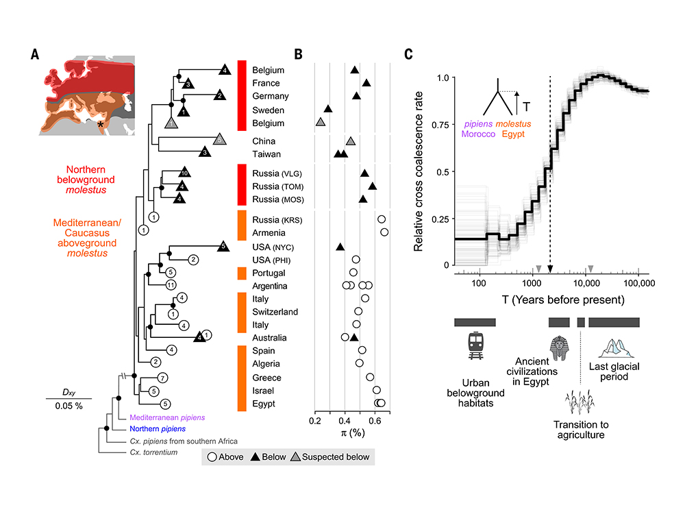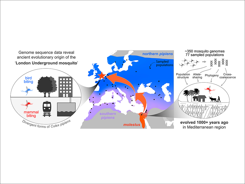地下家蚊在二戰期間嚴重騷擾倫敦地下陰涼環境,因其極度適應地下環境騷擾民眾而廣為人知,教科書也將此列為適應都市化演化的典型案例,然而研究團隊最新的基因序列分析卻描述了完全不同的故事。研究結果指出,都市叮人型的蚊蟲並非近代都市化產物,而是在1千至1萬年前的早期農業社會中即已演化出與人類共存的特性,可能源自古埃及或地中海地區。