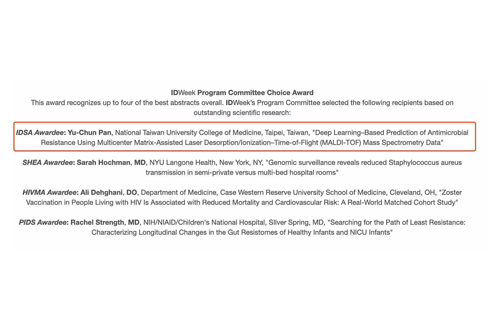 在全球感染症領域最具指標性的國際醫學盛會 IDWeek 2025中,臺大醫院急診醫學部教授李建璋所領導的人工智慧研究團隊,以「AI預測細菌抗藥性」研究勇奪 IDSA Abstract Award 首獎,從超過3000篇投稿中脫穎而出,榮獲年度「Committee Choice Award」4篇最佳論文之一,並名列第一,為臺灣醫學研究再創國際榮耀。IDWeek 為全球感染領域最頂尖的醫學盛會之一,每年吸引上萬名來自世界各地的成人與兒童感染科醫師、流行病學家及愛滋病研究學者,是全球跨學科參與人數最多的醫學大會。